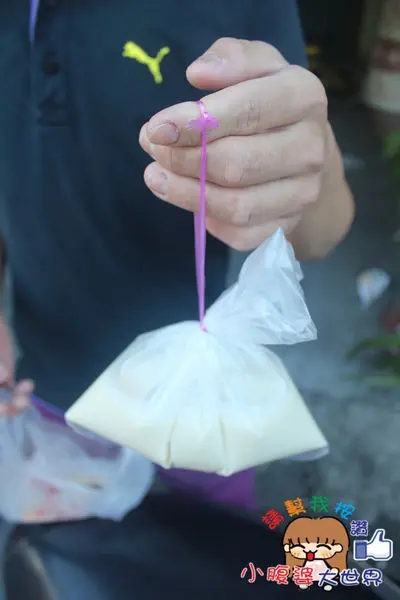 首先拿到的豆漿是像古早的方式用袋子裝著的,妳一提就可以走了~