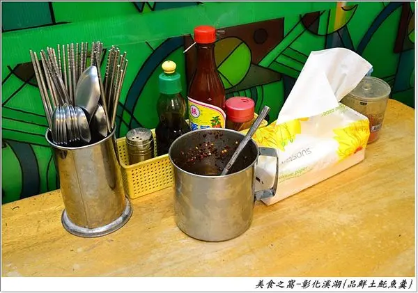 桌上的擺設很簡單,基本的餐具跟醬料是一定有的,但,光是辣醬就有三種,