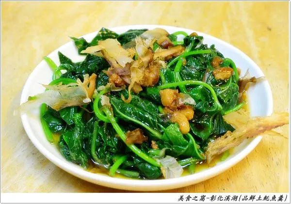 燙青菜(地瓜葉)雖然是只用水汆燙過,但淋上魯肉湯汁及柴魚片後,吃起來