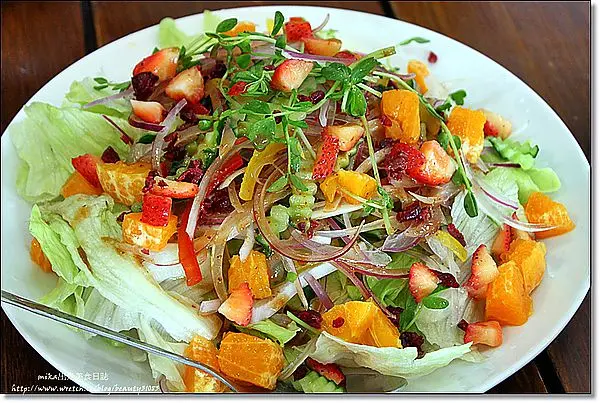 這沙拉真的有豐富,鮮果很多,有柳橙、草莓等水果,以和風醬汁佐醬,清爽好吃!!