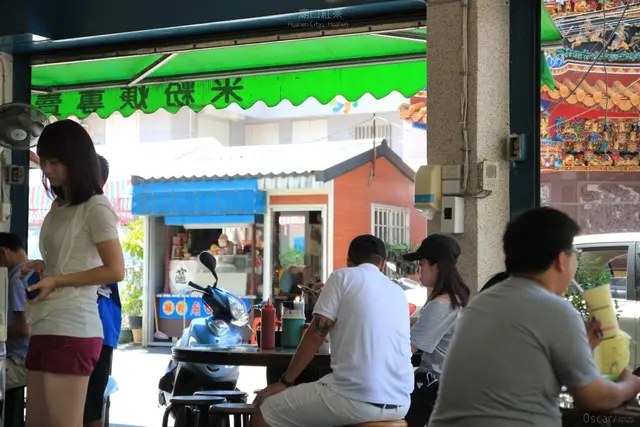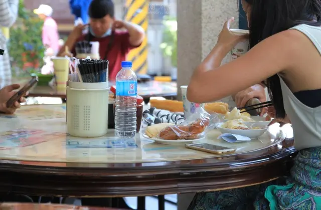 店家在騎樓擺上了一桌桌的桌椅 讓顧客可以在騎樓的陰影之下享受著餐點