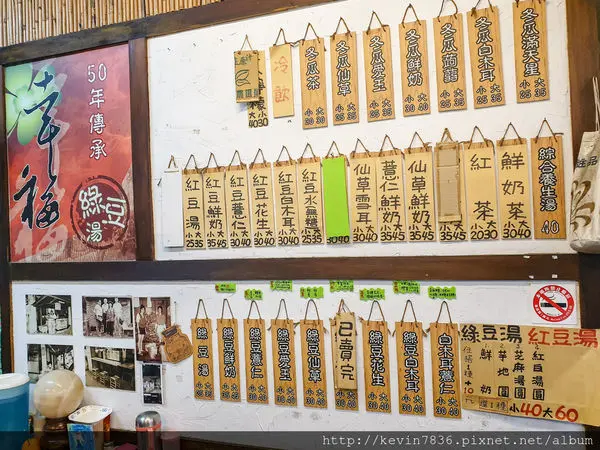 幸福綠豆湯的MENU在牆上,品項有冷飲.冬瓜茶.紅豆湯.綠豆湯.綜合養生湯等等,價位25-60左右,可說是銅板美食甜點,點好後我們在店內四處逛逛拍照趣