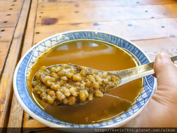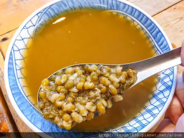 綠豆湯:舀起一匙綠豆,淺嚐一口慢慢咀嚼柔軟綿密的綠豆,甜而不膩口,湯頭爽口清甜,老爺邊吃邊開心的形容這口感