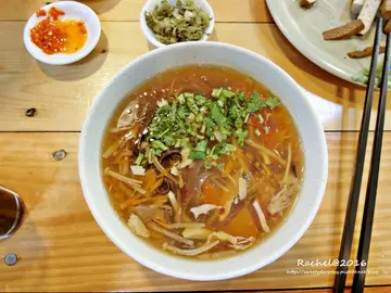 邁入冬天的新竹漸漸冷了,趁著好天氣週末去戶外走走,正愁著午餐不知道去哪吃好,章魚哥就說不如就去吃上次看到的『大蒜食堂』。這家店我第一次知道是因為我在往石門水庫的路上看到的,一邊田野中出現了大排長龍的車陣,很難讓人不去特別留意吧!只是那時候看到招牌寫著〝大蒜〞二字讓我著實害怕起來,直到那天無意間看到浩角翔起節目介紹,才發現他還有其他菜色可以吃,就這樣列入口袋名單裡。超人氣的大蒜食堂,週邊停車算很方便。吃飯要拿號碼牌排隊,不過翻桌率蠻快的~內部裝潢跟一般小吃店很不一樣呢!採用木頭桌椅,大量的透明採光,乾淨清新,讓整個用餐環境顯得優雅舒服~服務生會帶領去座位並寫上餐單桌號,寫好想吃的餐點拿去櫃檯即可,餐後結帳~瞄著菜單,那時候因為我們三個人都很餓了,整個就覺得每個都很想點。後來我們決定點一些一起分著吃,這樣大家都可以品嘗,紅槽蒜苗水餃、韭高混合餡煎餃、紅燒牛肉麵、紅槽酸辣湯、滷肉飯及滷味。魯味的部分,之前看浩角翔起介紹好像很厲害,於是我們也決定去挑個幾樣品嚐一下~看到這魯味實在食指大動,不過以單價來說我覺得不算親民,夾好之後給店員,他們處理好就會送過來~除此之外還有飲料,看到冰箱裡面販售著新竹有名的仙草汁,忍不住就拿了一罐這罐仙草汁讓我覺得很不一樣,第一他很濃稠感覺實在,第二他不甜,所以可以喝出很濃厚的仙草汁味道,一瓶35算很推薦~醬料在自助區,可自行取用魯味登場!豆乾,我覺得這是這盤魯味裡面滷的最有香氣味道的(推薦)豬腱肉、鴨蛋、百頁豆腐,這些感覺普普通通的~魯肉飯$40份量算很大碗,神奇的是居然有肉鬆和酸菜@@魯肉的醬汁算普普,整碗搭起來也算是順口,不過並不會讓我留下特別的印象韭高混合餡煎餃$50(8顆)這個煎餃在於他最好吃的口感是上桌那熱騰騰的瞬間,而且他們家的皮非常的薄,於是在煎過剛好的溫度時會非常的脆,內餡的部分雖然是韭菜跟高麗菜混合,但是卻不會讓我覺得有很重的味道,蠻好吃的耶~紅槽蒜苗水餃$100(10顆)這個可畏是大蒜食堂的招牌菜,當然一定要品嚐一下!仔細端詳這個水餃,外表看起來也不特別,但是咬下去卻有種說不出來的口感,內餡還有吻仔魚,是一種很另類的水餃,不難吃但很不習慣,哈哈~紅槽酸辣湯$50這個酸辣湯比較像是羹湯,裡面還有加肉羹很特別,不過口感比較偏重酸,沒有辣的口感,喜歡重口味酸辣的人可能要再自己加一些調味~紅燒牛肉麵$130這個餐點是我覺得在這間店裡面最合我口味的!!!他的紅燒湯頭很清爽不油膩,有番茄的香味,牛肉也燉得很熟透軟嫩,咬下去都是滿滿的牛汁香味,搭上清爽的湯頭、煮的剛好滑順麵條,一口一口都是享受~…查看更多