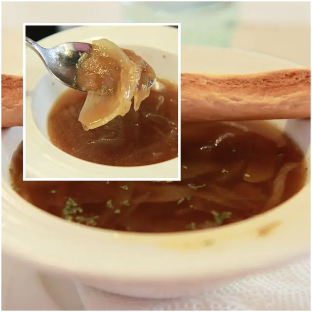 這「法式洋蔥湯」不同於多數的洋蔥濃湯:將大量洋蔥久熬至溶化在湯內,它喝起來是清甜無濃稠感的口感,將洋蔥熬煮至軟,洋蔥鮮甜的精華釋出,但仍吃得到洋蔥的實體,是很清爽鮮甜的一道湯品。