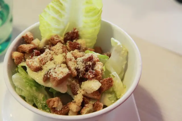 套餐搭配的「凱薩皇沙拉」,新鮮美生菜和萵苣,簡單灑上酥脆的吐司邊和培根碎,再淋上略帶嗆辣的凱薩醬和起司粉,好吃~ 生菜沙拉就是要新鮮的尚青!