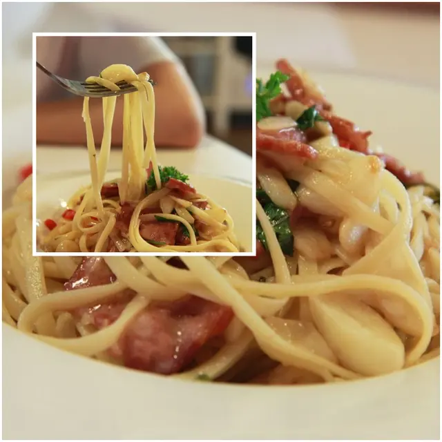 苦思許久,我們決定選擇經典的義大利麵「香蒜培根辣椒細扁麵」和本店的人氣招牌「帕達諾起士肉腸香料燉飯」來嚐嚐~