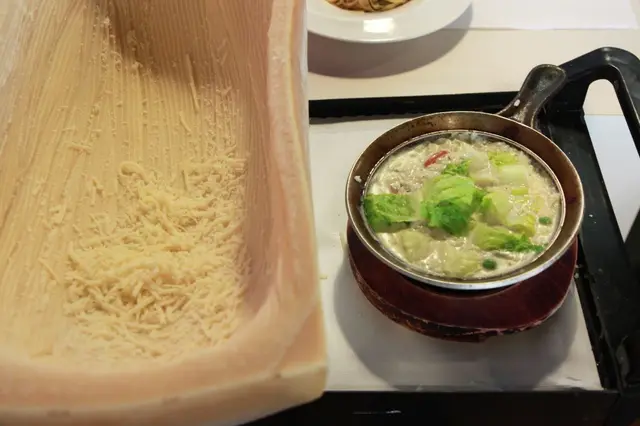 人氣招牌「帕達諾起士肉腸香料燉飯」的出場超有架勢!服務生用推車將剛煮好的燉飯和一大塊「義大利進口的帕達諾起士」一起推到客桌旁進行「桌邊服務」,現場使用刨刀刨下新鮮帕達諾起士絲,並撲滿在燉飯上!