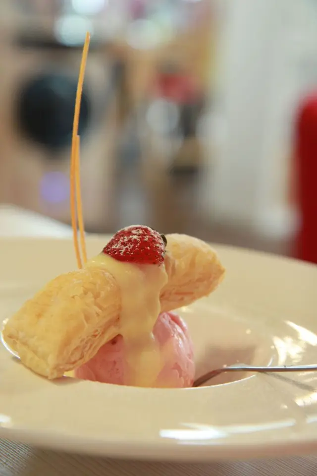 千層派淋上的卡士達醬,香甜而不膩,可以沾著底下的草莓冰淇淋一起食用,很令人滿足的一道甜點!