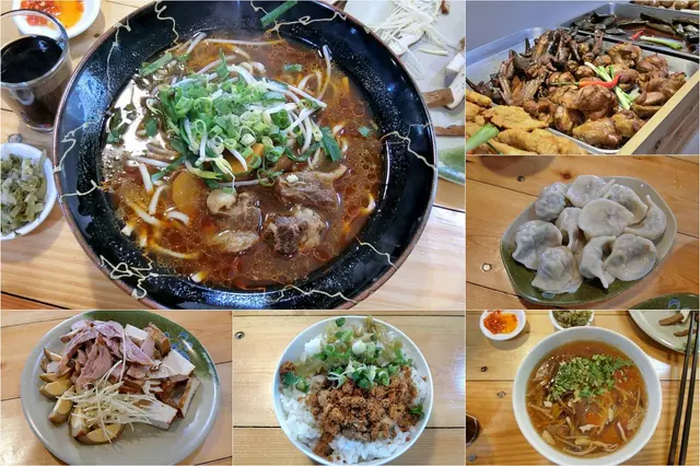 瞄著菜單,那時候因為我們三個人都很餓了,整個就覺得每個都很想點。後來我們決定點一些一起分著吃,這樣大家都可以品嘗,紅槽蒜苗水餃、韭高混合餡煎餃、紅燒牛肉麵、紅槽酸辣湯、滷肉飯及滷味。