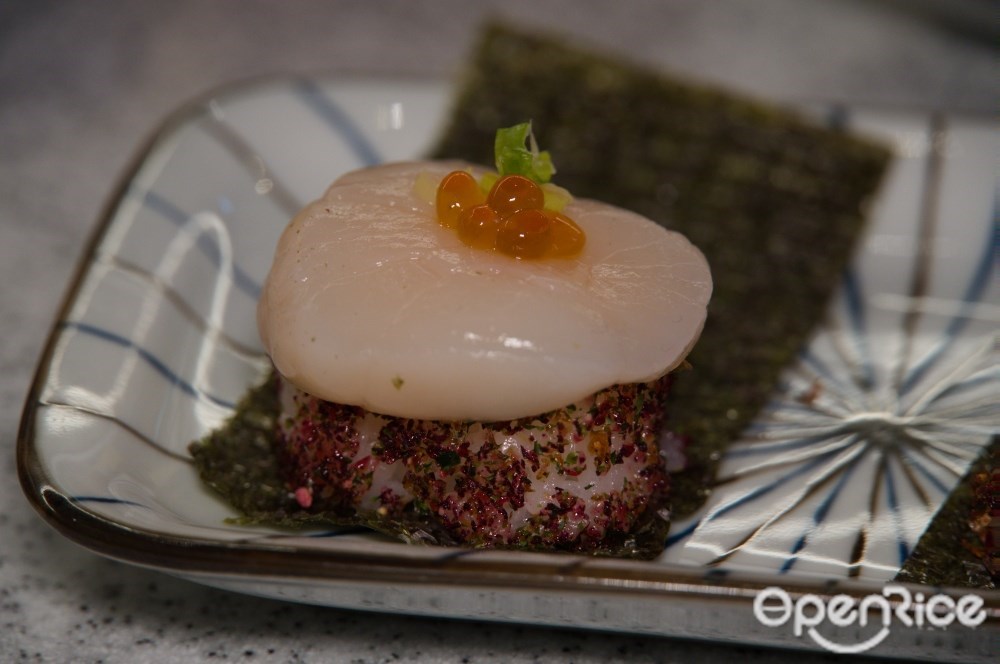 MAGiC TOUCH今天春天菜單增添繽紛色系來彰顯春天花漾感,推出多款新潮百味的壽司,突破大眾對日料的既定印象,帶來「不像壽司的壽司料理」體驗。其中「鮮彩干貝壽司」以新鮮北海道大干貝,配上紫蘇白飯,最後由鮭魚卵點綴,整體入口的酸甜鮮香,尾韻帶點紫蘇味回甘,令人回味無窮。「爆汁櫛瓜拿破崙」以現炸櫛瓜配上莎莎醬與橙子,鎖住櫛瓜的水分及甜味, 一口咬下多汁又酥脆!