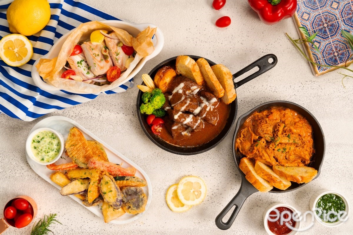 全新菜單中的「地中海市場好好逛系列」,選用地中海飲食常見的橄欖油、酸豆、紅酒、番茄、香草等元素,帶領大家以味覺遊歷南法、希臘、義大利市集,其中「普羅旺斯燉牛肉」和「佛羅倫斯燉牛肚」以紅酒為基底,將牛肩肉燉煮至入口即化、牛肚慢燉入味,番茄香氣融入其中呈現出酸甜醇厚的多層次滋味。「希臘風鮮烤鱸魚」則以初榨酪梨油輕刷鮮鱸魚,佐以檸檬、百里香與酸豆慢烤出鮮嫩多汁的飽滿肉質。「西西里炸蔬菜」精選甜椒、玉米筍、茄子、香菇、杏鮑菇與栗子南瓜等多種時蔬,酥炸至金黃香脆,搭配羅勒美乃滋,展現西西里島飲食特色。