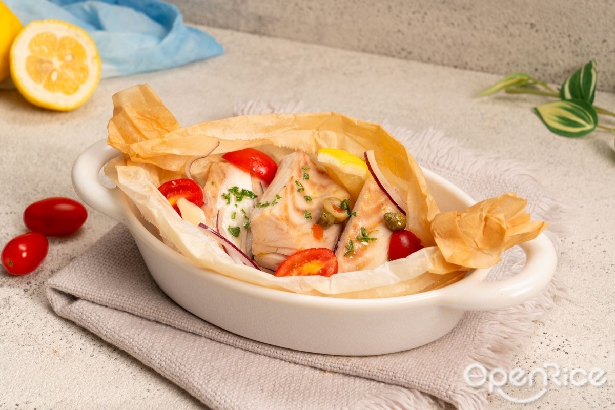 「希臘風鮮烤鱸魚」 以初榨酪梨油輕刷鮮鱸魚,佐以檸檬、百里香與酸豆慢烤,鮮嫩多汁,散發濃郁地中海風情。