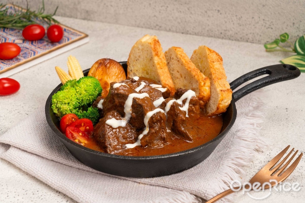 「普羅旺斯燉牛肉」以紅酒為基底,燉煮牛肩肉至軟嫩如絲、入口即化,濃郁番茄香氣融入其中,散發豐富層次滋味。搭配外酥內軟的法國軟法麵包,更添質感與飽足,完美呈現南法美食的誘人風情。
