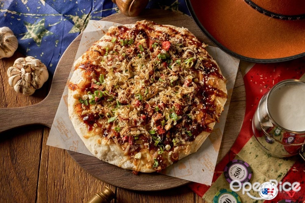 「美牛嘉年華」主題菜中的蔥花照燒牛肉 Pizza,使用美國牛肉牛肩背,淋上特調的照燒醬汁,搭配濃厚香氣的柴魚花、七味粉、白芝麻。