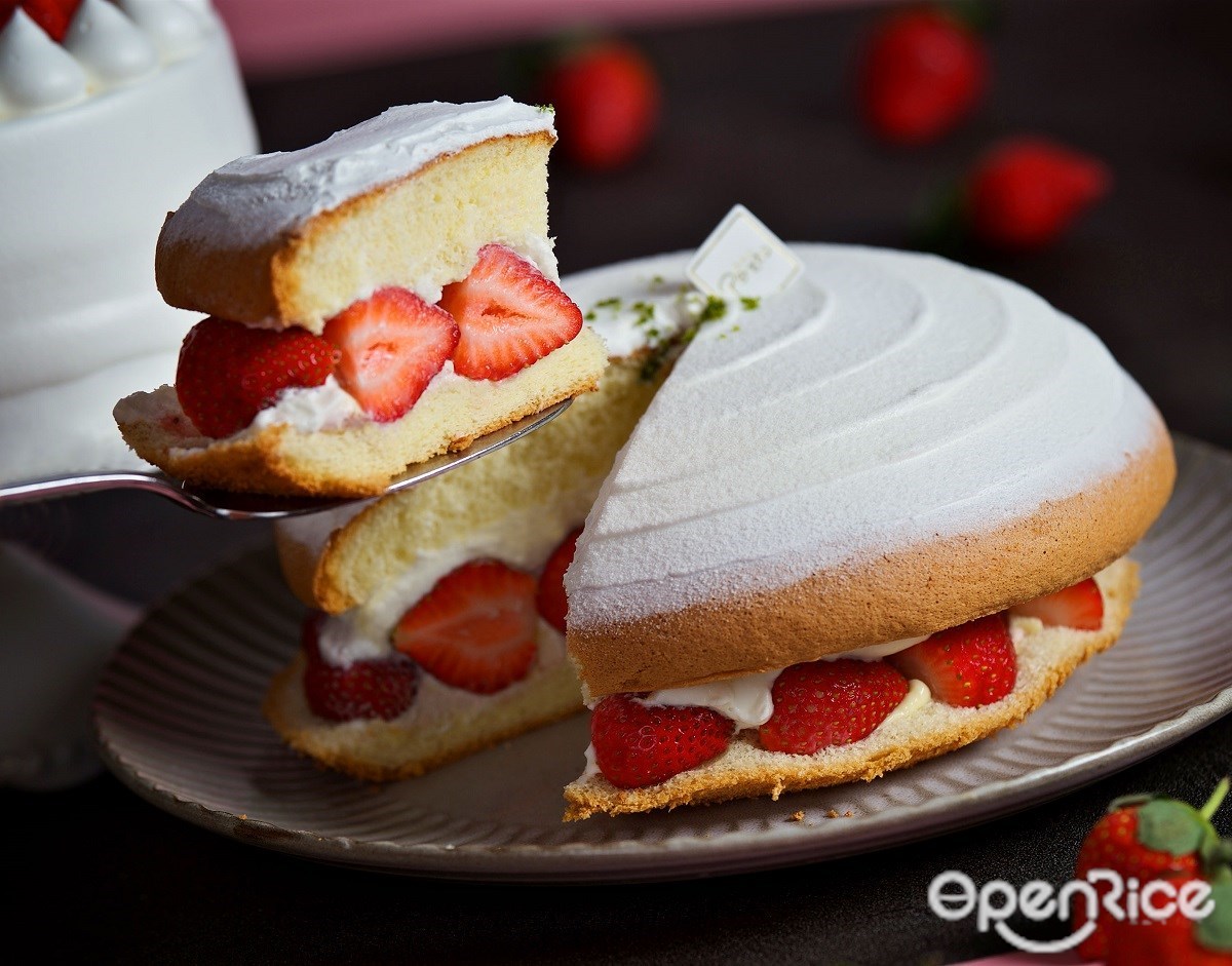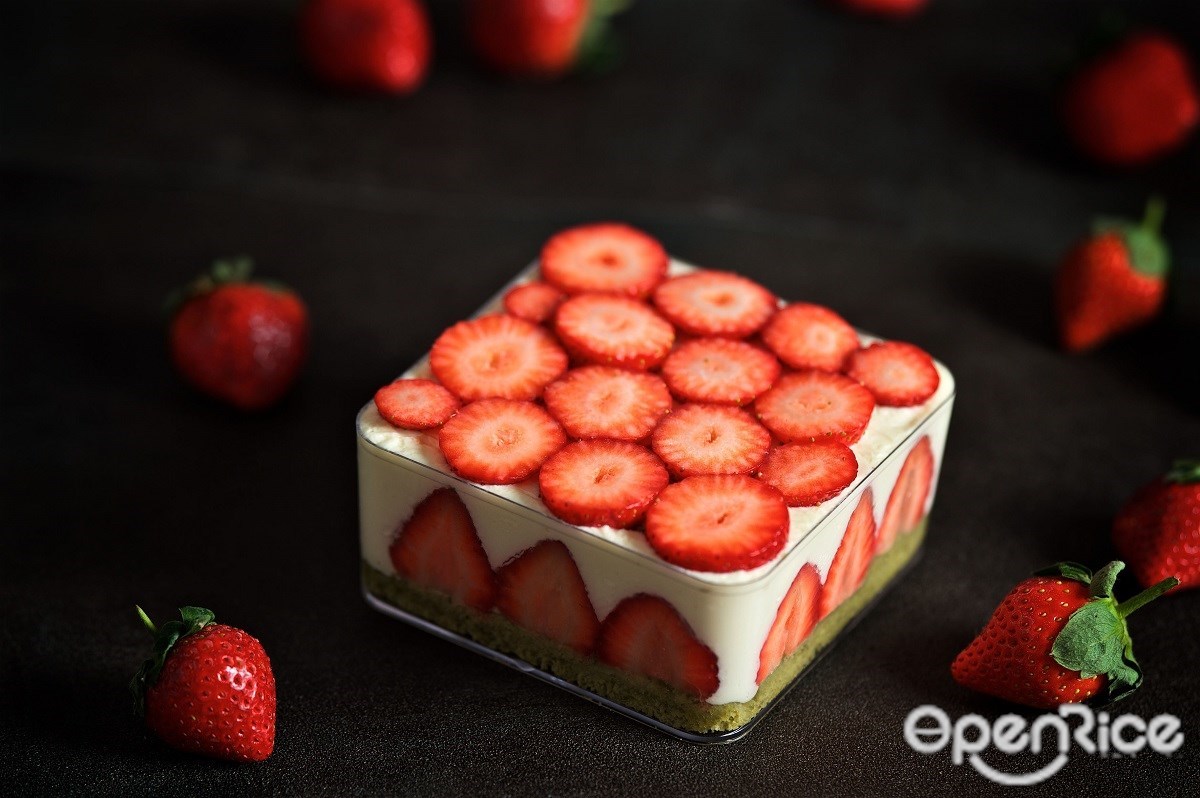 曾創下熱銷破千盒的「草莓寶盒」,有別於一般法式蛋糕,甜點主廚以抹茶手指蛋糕為基底,採用日式手法拌入白巧克力及抹茶粉。為避免口感不佳,攪拌麵糊時需適度拿捏力道,再以高溫烘烤半小時,相當考驗主廚功力。綿密細緻的抹茶手指蛋糕體,夾入超過15顆滿滿草莓和馬斯卡邦慕斯,一口咬下體驗三種不同風味,酸甜交錯、尾韻帶有淡淡抹茶香氣,甜而不膩的清爽滋味,令人難以忘懷。