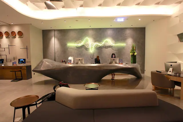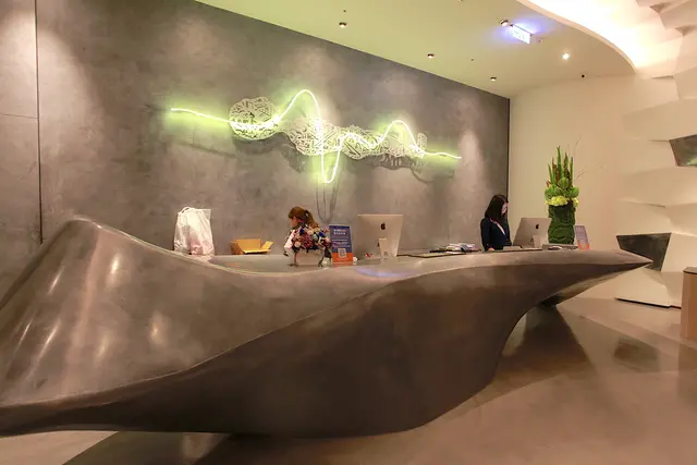 金屬元素流線型的服務櫃檯,勾起精品飯店整體的設計氛圍。