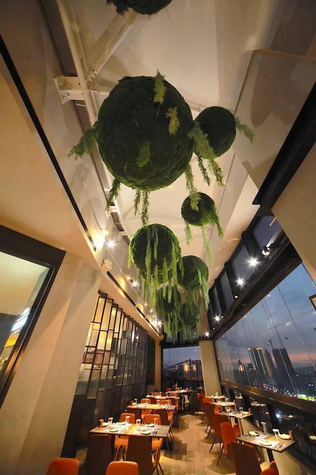 挑高的空間吊滿綠色圓形的植栽,這個爬藤造型植栽當然是裝飾品。