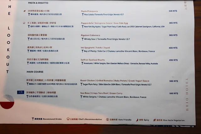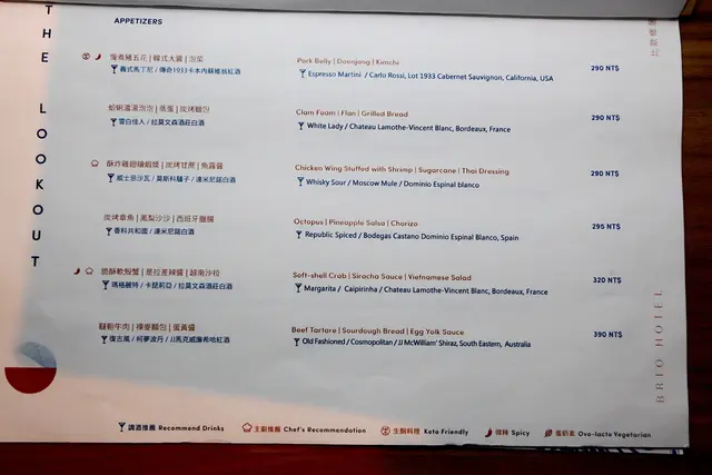 這本經過設計有質感晚餐菜單,由米其林摘星廚藝總監經驗,有別傳統提供無國界的創意料理,單點價位在190-890元之間,且菜單也有多人的套餐供選擇,晚餐時間17:30~22:00 大人低消500元/人(週五六550元)、6歲以下300元/人;酒吧時間22:00~01:30 低消350元(週五六400元),以上以新台幣計且需要收10%服務費。