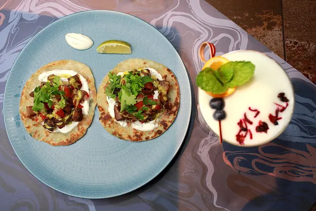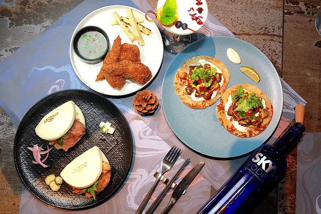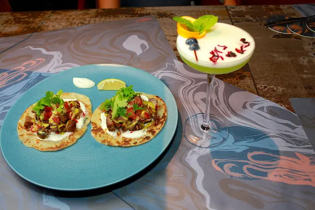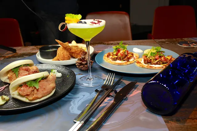 餐桌上有酥炸雞翅鑲蝦漿 / 炭烤甘蔗 / 魚露醬290元、 燉牛舌 / 蔥抓餅 / 奇米秋里醬270元、 刈包 / 炸雞 / 山葵美乃滋230元及調酒倫敦綠道350元等,菜單上每種主菜皆有建議的調酒,可以搭配主菜來滿足您的味蕊。