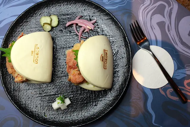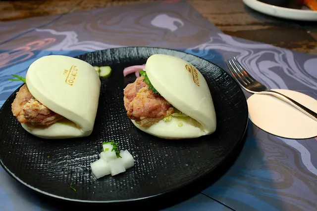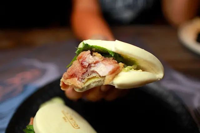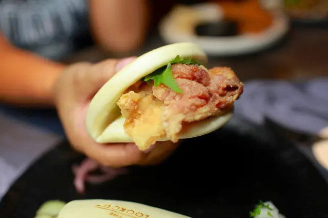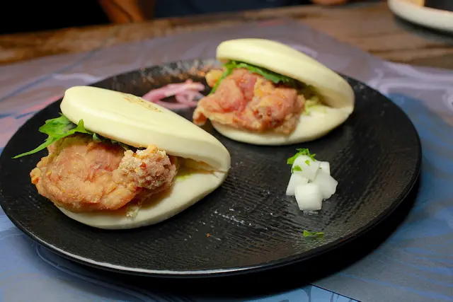 使用剛蒸過鬆軟的刈包, 夾著日本片栗粉酥炸的雞腿肉,搭配日式風味的山葵美乃滋,,放入綠紫蘇以及醃製過的蔬菜,就完成這道無國界創意料理美食。