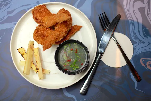 這瓷盤上有酥炸雞翅鑲蝦漿、炭烤甘蔗及魚露醬等。