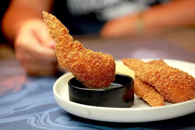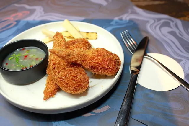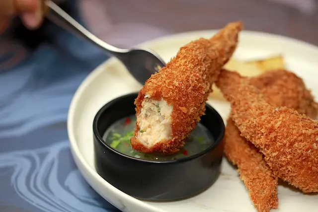 原來概念由經典的甘蔗蝦為基礎,運用了西式炸物的製作手法,將二節雞翅內部去骨之後,將新鮮手打的蝦泥灌入雞翅中, 整體裹上麵包粉後酥炸。