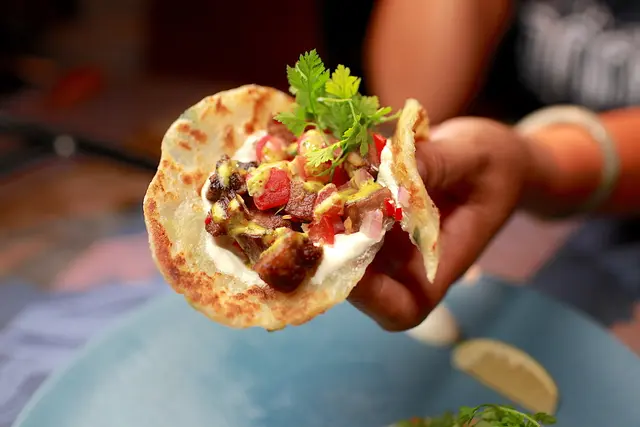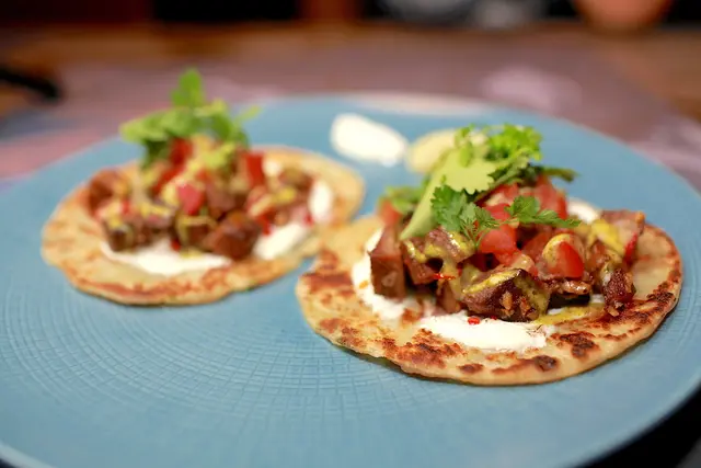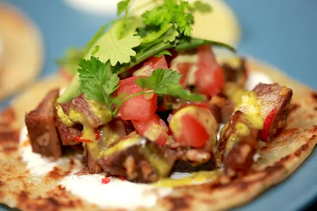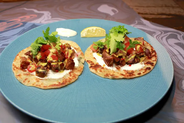 使用很普通的蔥抓餅來製作料理,上面有牛舌肉、蕃茄、酸奶及香菜等食材。