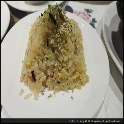 貴妃流金飯,名字超唯美,擺盤成尖塔狀,很有巧思和創意,米飯粒粒分明,乾溼適中,還佐上芝麻,非常美味,個人蠻喜歡名字和吃起來的口感,讓我印象相當深刻。