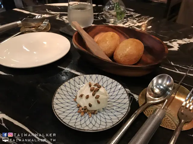 Akame自己製作的酸種麵包,配鮮奶油、燻烤大麥跟海鹽,塗上麵包鮮奶油跟大麥香氣撲鼻,大麥也讓麵包增加口感。