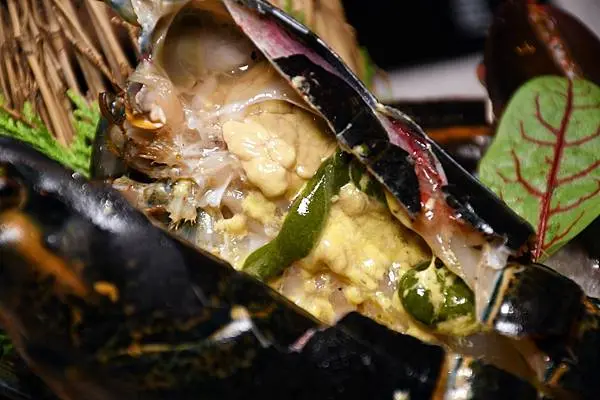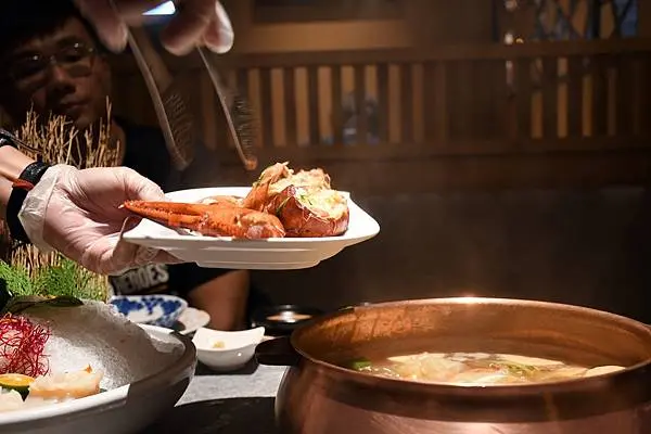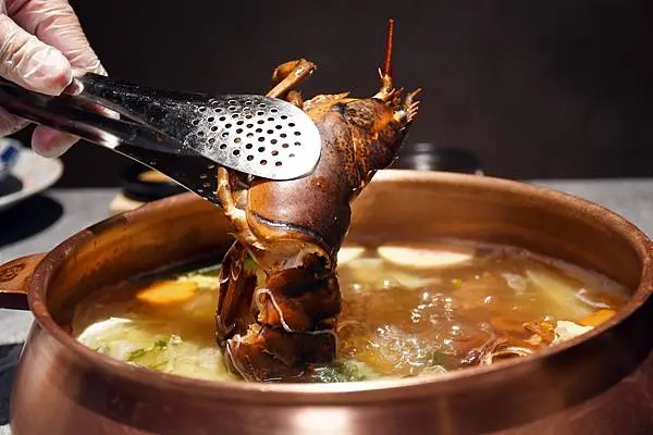 將精華煮入昆布湯後,會將龍蝦夾起,為我們進行切割分食