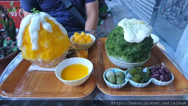 點完餐,裙擺搖搖$200,有附芒果、芒果醬、芒果奶酪,刨冰上面是椰奶,裡面還有一球明治冰淇淋,美姬的富士山$160,紅豆、白玉、抹茶凍、刨冰上面淋了久丸小山元糖漿跟起司醬,裡面也是包著一顆香草口味的明治冰淇淋。