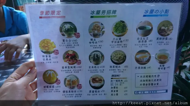 推門進冰屋,整個人就彷彿是走進芒果裡,整個空間飄散的芒果香味,讓人好想馬上來一盤芒果刨冰啊,冰屋裝潢跟冰品走都是日式風格,採取自助式服務,就是要自己找位置,然後再到櫃檯點餐,之後在自己到櫃台取餐。那天是週六下午,所以美姬一行人到的時候,整個一樓已經坐的滿滿滿了,立刻前往往二樓,哇~兩樓也都滿了,而且大家桌上都是空的,所以要在店內排隊是不可能了,就在我們走出大門時,發現剛好有騎樓有人用完餐離開,剛好有個空的桌子跟幾張椅子,美姬二話不說馬上桌下,紹興媽再去張羅不夠的椅子,紹興爸則是進去拿菜單,要吃好的就是這樣分工合作。