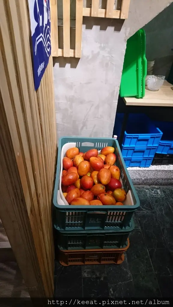 在樓梯旁邊有一籃芒果,但是在騎樓下有堆到快到天花板的空水果籃,就知道店家生意有多好了。