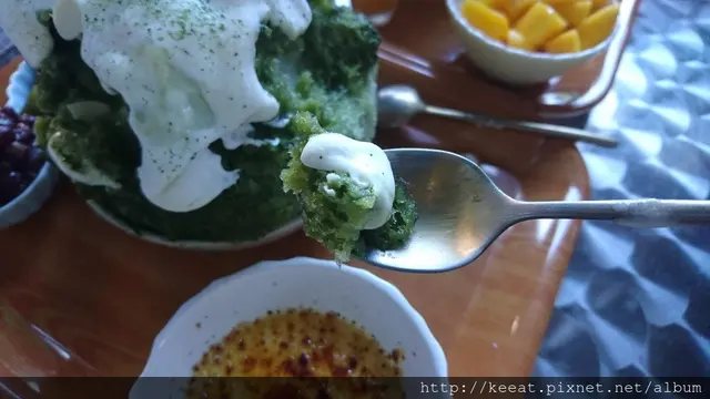 上面的起司醬吃起來很香很濃,然後有點微鹹,刨冰本身非常綿密跟細緻,再淋上不甜抹茶味很濃郁的糖漿,一入口~哇!好好吃喔!是美姬沒有吃過的味道跟口感組合,突然就懂了紹興爸媽想表達的意思,一定要自己來吃吃看才能體會,比較可惜的是,裡面包的是香草口味的明治冰淇淋,所以吃到中間的部分,抹茶味會變淡,像美姬這種重度抹茶控,覺得裡面如果包的抹茶口味的冰淇淋就更棒了。