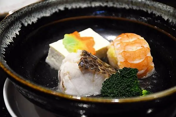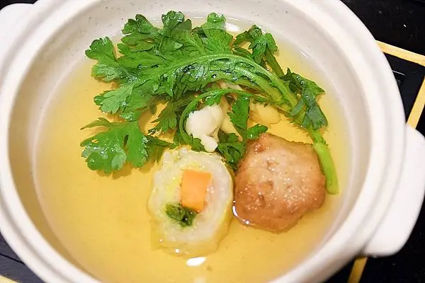 以山茼蒿搭配蔬菜捲,以及特別的手工蓮藕花枝漿、北寄貝貝唇為呈現,暖心又暖胃