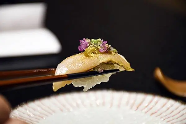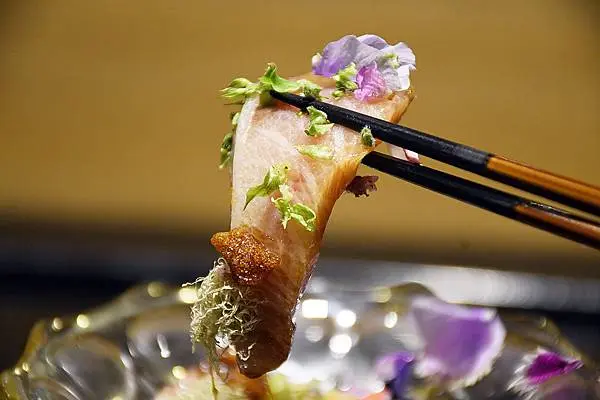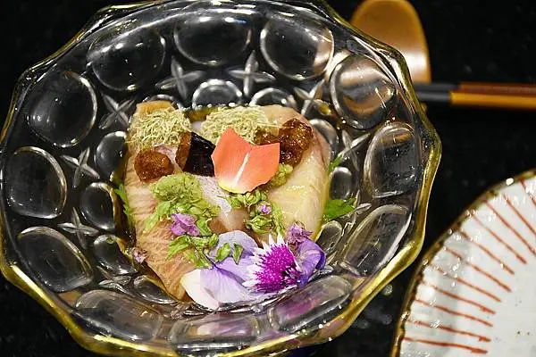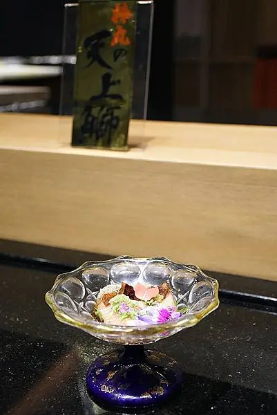 不僅有醬油凍的鹹甜味道、同時以昆布提點了出了天上鰤的鮮味,食用花則在尾韻咀嚼之際,在嘴中出現了花香的味道