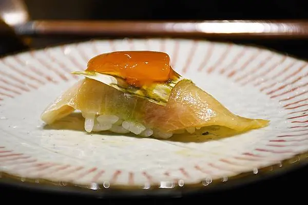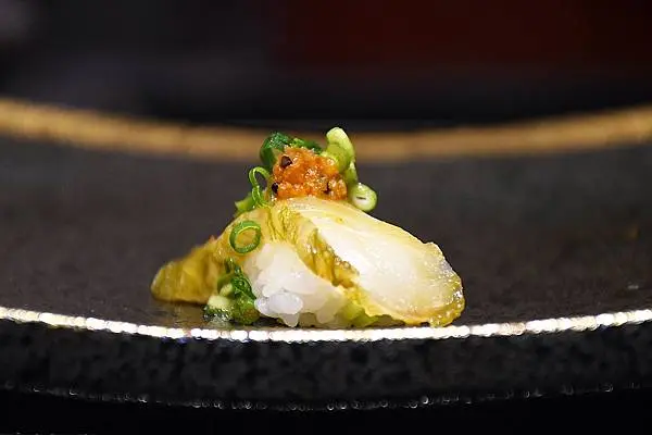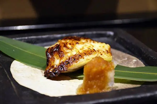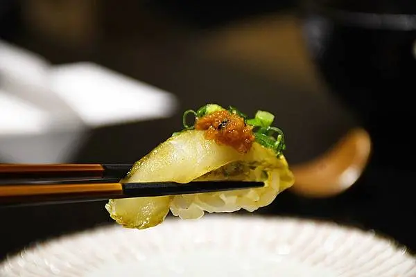 油脂豐富的大鯃魚搭配柚子胡椒味道上強烈卻帶有記憶點