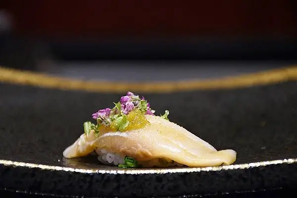 取代過去以哇沙米做搭配,辣蘿蔔把比目魚的清爽度提升、同時那辣中帶清甜的風味也藉由魚肉呈現出來
