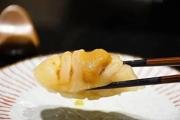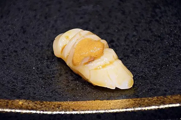 先上一層海膽醬油後,再以烏魚子松露醬作為帆立的點綴