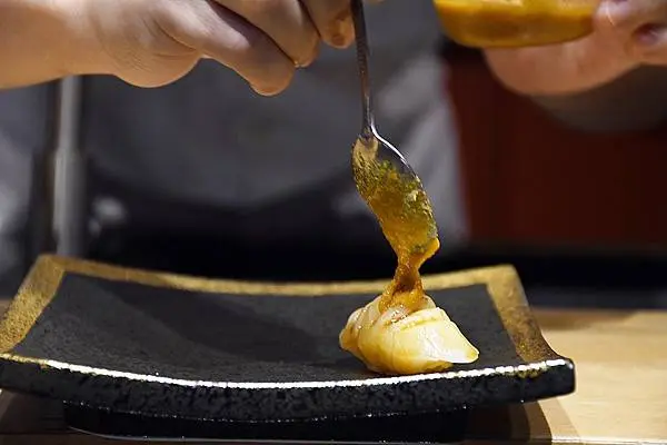 它與過去既定印象的日料有所差別~五味澤先生就像是日料的魔術師、彩妝師,憑藉著多年以來的經驗以及對食材認知與專業,利用醬汁、醬料來將味道點出提出,創造更多的豐富性