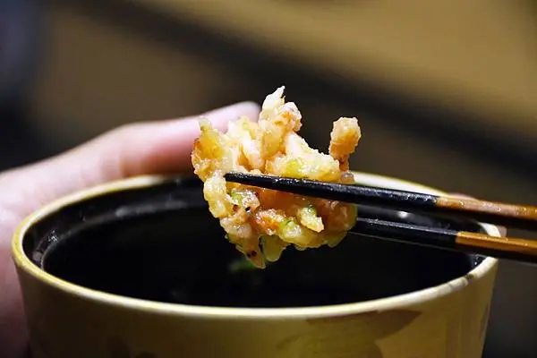 同時香酥櫻花蝦經過酥炸後、浸泡後,儘管脆度少了許多,但是每一口依然帶有著外酥內細緻的口感