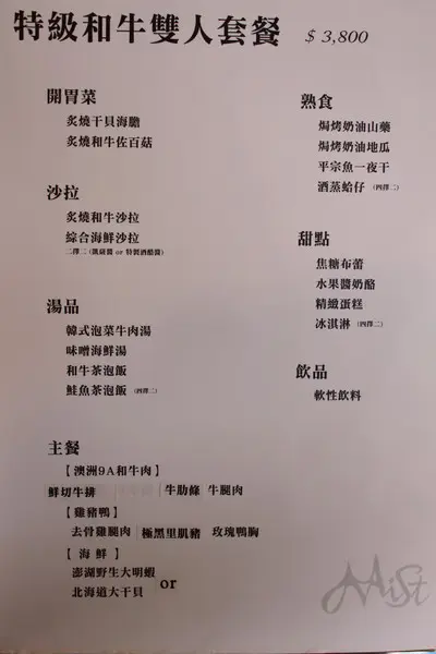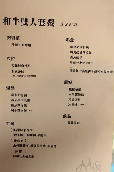 這次我們體驗的餐點是特級和牛雙人套餐$3800 開胃菜 炙燒干貝海膽 炙燒和牛佐百菇