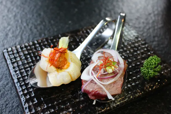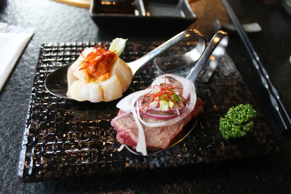 干貝海膽很鮮甜 愛吃生魚片的友人表示:真的好好吃!!!! 和牛百菇大概三分熟而以比較生 但他的調味蠻讓我接受的 (我不太敢吃太生的牛肉) 兩道開胃菜都很精緻可口 滿意