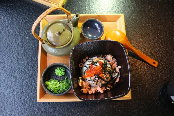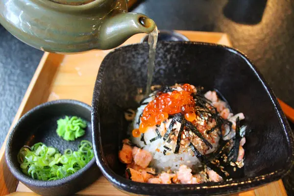 鮭魚茶泡飯的鮭魚肉也很多很大塊 上面佈滿了鮭魚卵 加上他們的茶泡飯的茶很好喝 這樣單純的鮭魚茶泡飯我吃的 超級滿意 哈哈哈