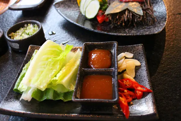 菜盤部分 生菜 辣味曾醬 大蒜 辣椒 滿像我在韓國吃到的燒肉組合 有生菜真的比較解膩 辣味噌醬的味道也很特別