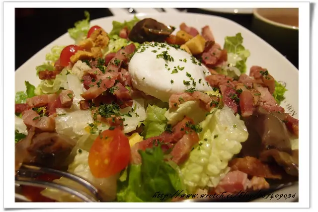 大份量的生菜沙拉上灑滿培根條&麵包丁
