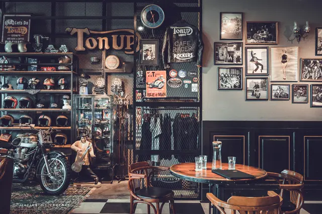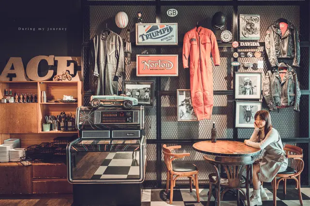 之前來八里,就有注意到融入在一整排景觀餐廳中的 Ton Up Cafe,外觀呈現深色系的 Ton Up Cafe 彷彿套上一層神秘面紗,從外面看不清餐廳的樣貌,沒想到裡面卻別有洞天,宛如穿越到60年代的英國電影中,一進到餐廳裡讓我們不斷驚呼好美!復古的重機成為了最注目的焦點,搭配上一些搖滾音樂的元素,完美的展示了英國的騎士文化。
