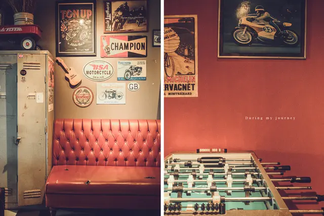 循著階梯來到二樓,明亮的光線透過大面積的落地窗灑落室內,讓人感受到與一樓稍有不同的氛圍和調性,牆上掛了各式各樣的皮衣、掛畫,在角落中藏有皮箱、打字機、少見的古董點唱機,甚至還有手足球檯,隨處都是驚喜,也是老闆四處蒐集而來的寶藏,若喜歡老物件的人想必會很著迷!