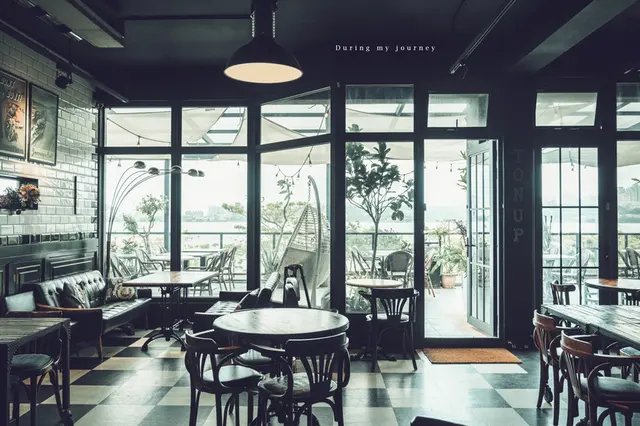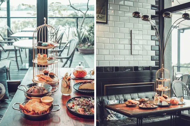 外觀呈現深色系的 Ton Up Cafe 覆蓋上了一層神祕感,從外頭看不清樣貌,走進餐廳卻讓人大開眼界,黑白相間的地磚襯托出優雅的情調,角落擺放了頗為帥氣的重機、四周則充滿著懷舊的老古董和物件,混和了復古的英倫工業風格,宛如穿越到60年代的英國電影場景裡;然而餐廳不只如此,二樓的戶外座位區坐擁了八里的河畔風光、收錄了舒心又療癒的風景,在這裡彷彿能找到出國度假的片刻時光。